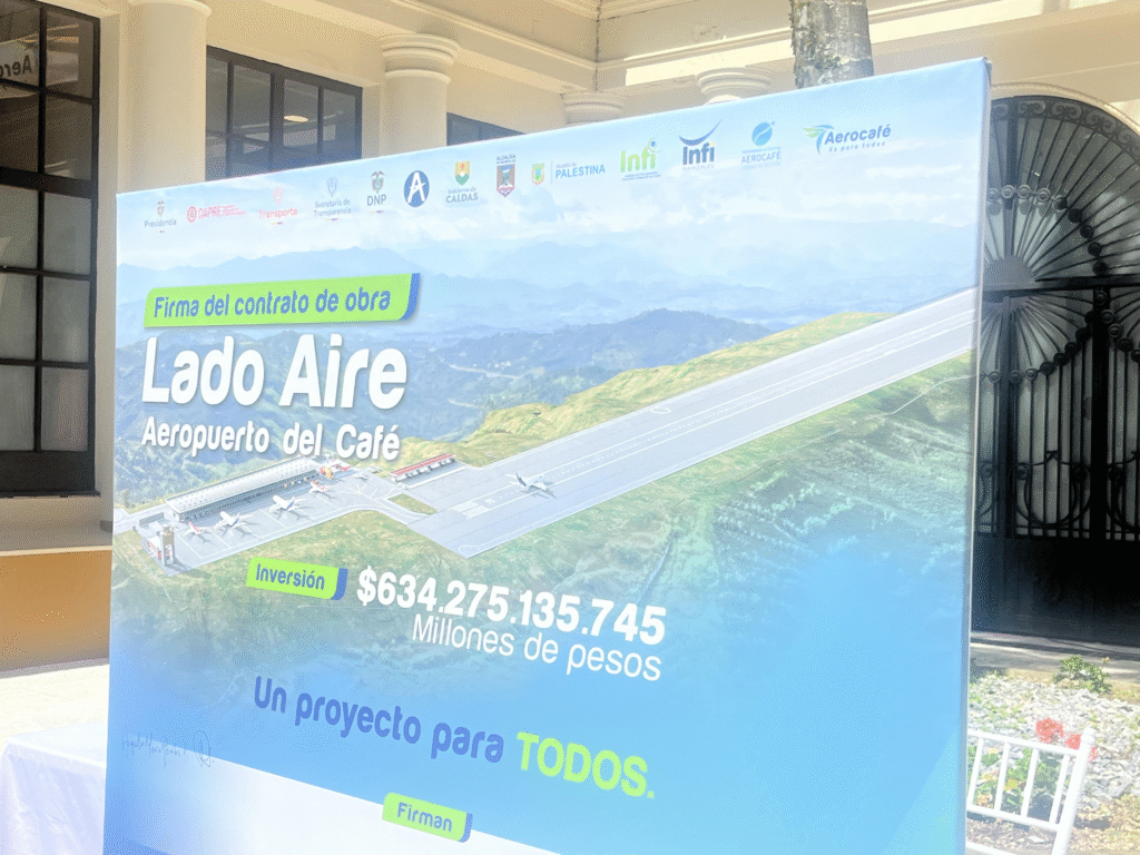 El acto de protocolización de la firma del contrato para la construcción de la fase 1 de Aero café, parece convertir en realidad esta anhelada obra para los caldenses y la región. Dicho acto estuvo presidido por el gobernador de Caldas, Henry Gutiérrez Ángel y acompañado por el gerente del Patrimonio Autónomo Aero café; Fernando Merchán; la viceministra de transporte e infraestructura, María Fernanda Jaramillo; el director encargado de la Aerocivil, Alfonso Martínez y el representante legal del consorcio Aero café SK, Luis Fernando Solarte, el alcalde de Palestina, Álvaro Andrés Osorio, entre otros.