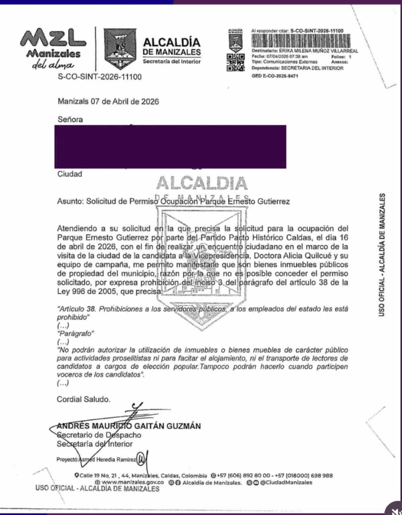 El comunicado emanado de la secretaría juridica de la alcaldía de Manizales, en cabeza del profesional Andrés Mauricio Gaitán Muñoz, en respuesta a una solicitud de permiso para ocupación del Parque Ernesto Gutiérrez, para una actividad política, se expresa que no es posible conceder dicho permiso, por expresa prohibición del inciso 3 del parágrafo del artículo de la ley 996 de 2005, que precisa: “no podrán autorizar la utilización de inmuebles o bienes muebles de carácter público para actividades proselitistas ni para facilitar el alojamiento, ni el transporte de lectores de candidatos a cargos de elección popular. Tampoco podrán hacerlo cuando participan voceros de los candidatos”.