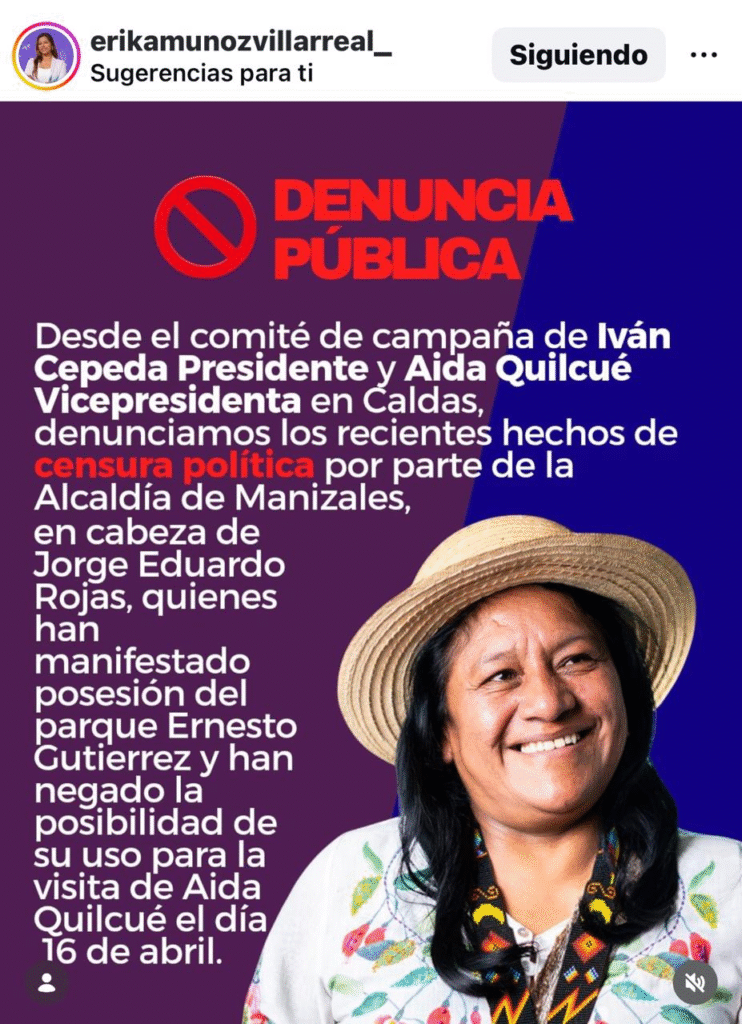 Entre tanto, como una denuncia pública, el comité de campaña de Iván Cepeda presidente y Aida Quilcué vicepresidenta, en Caldas, denunciaron estos hechos lo cual calificaron como censura política por parte de la alcaldía de manizales, en cabeza del mandatario local, Jorge Eduardo Rojas, quienes han manifestado posesión del Parque Ernesto Gutiérrez y han negado la posibilidad de uso para la visita de Aida Quilcué el día 16 de abril.